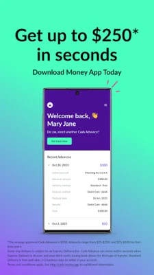 A Money App Cash Advance is NOT A PERSONAL LOAN. It has a 0% Annual Percentage Rate (APR) and no mandatory fees. You may pay an optional fee for expedited funds delivery. For a $40 advance with an Express Delivery fee of $4.99, your repayment amount will be $44.99. Money App cash advance is a non-recourse product, not a personal loan, and there is no mandatory minimum or maximum timeframe for repayment; you will not be eligible to request a new advance until your outstanding balance is paid. Repayment periods typically range from 1 to 103 days, depending on user activity and eligibility. See Cash Advance Agreement and http://cash.money.app for additional terms, conditions and eligibility requirements.